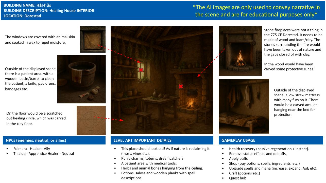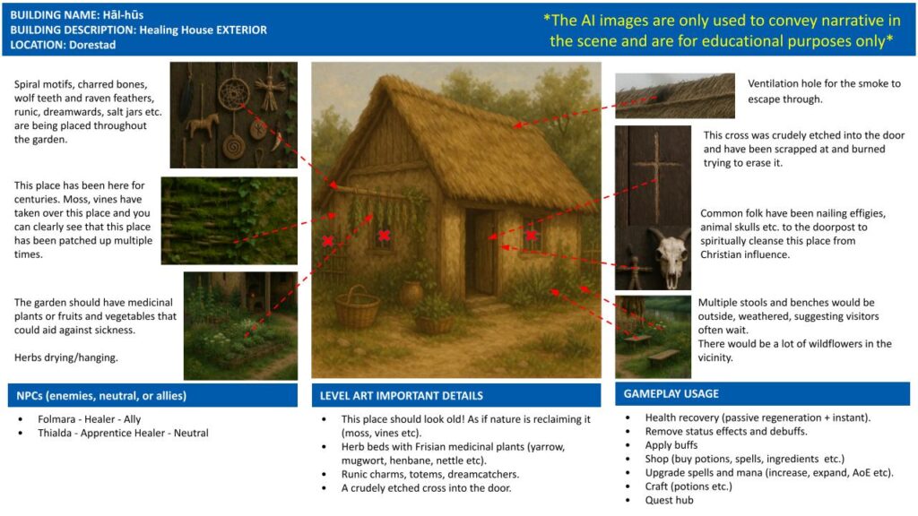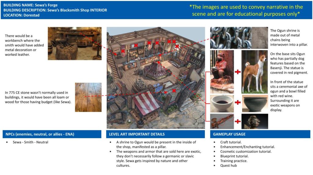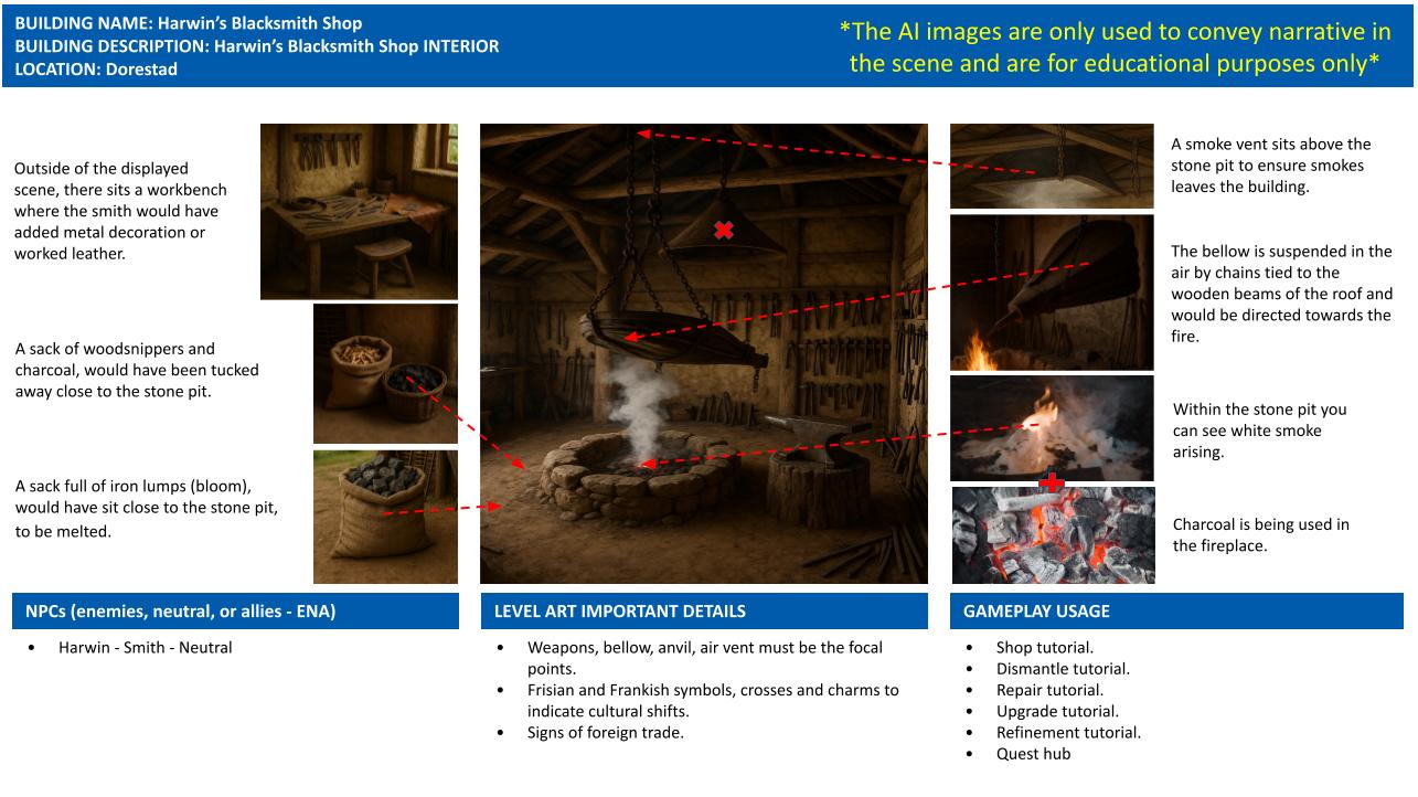 - Highlighted narrative and gameplay usage and tied them to key NPCs, with concise description for quick reference on how the environment supports the story.