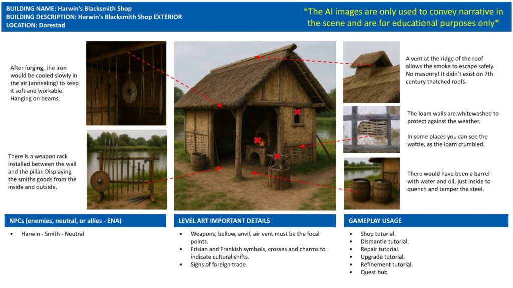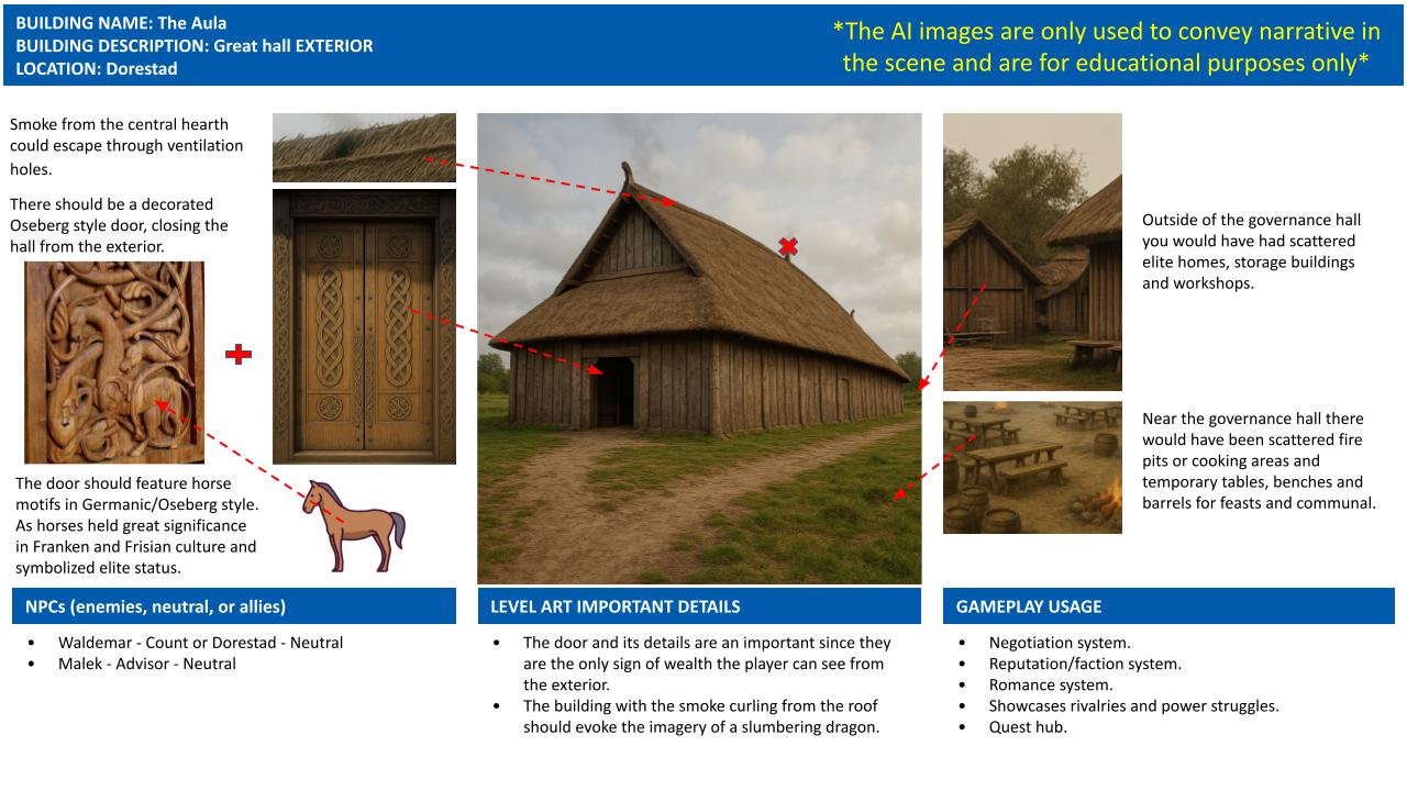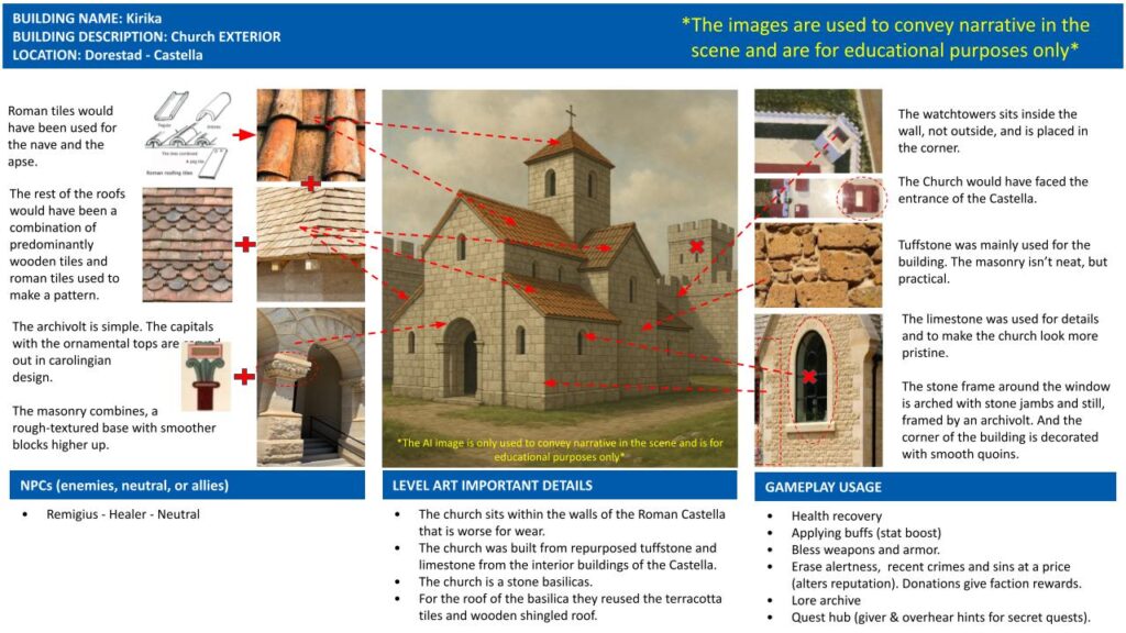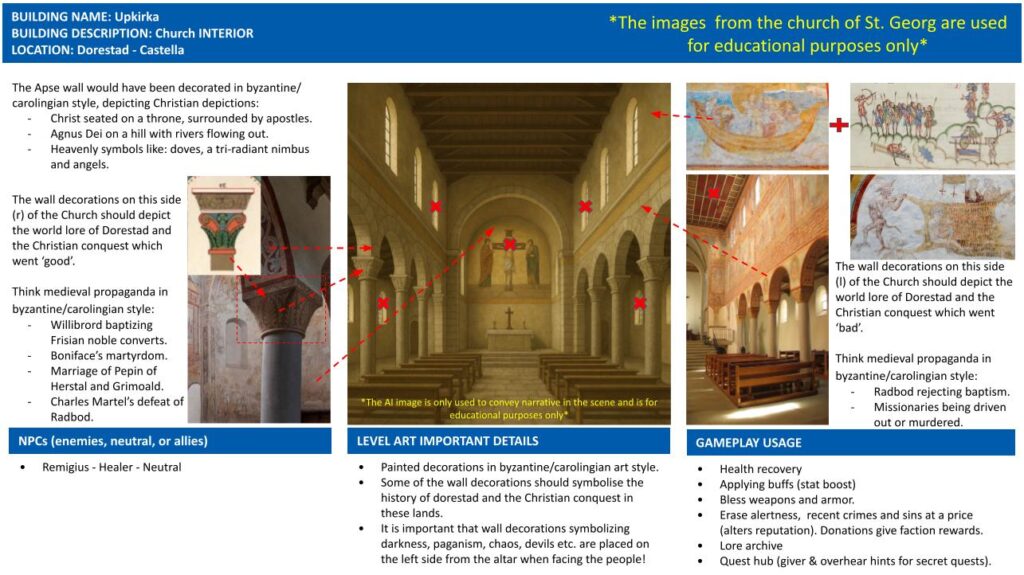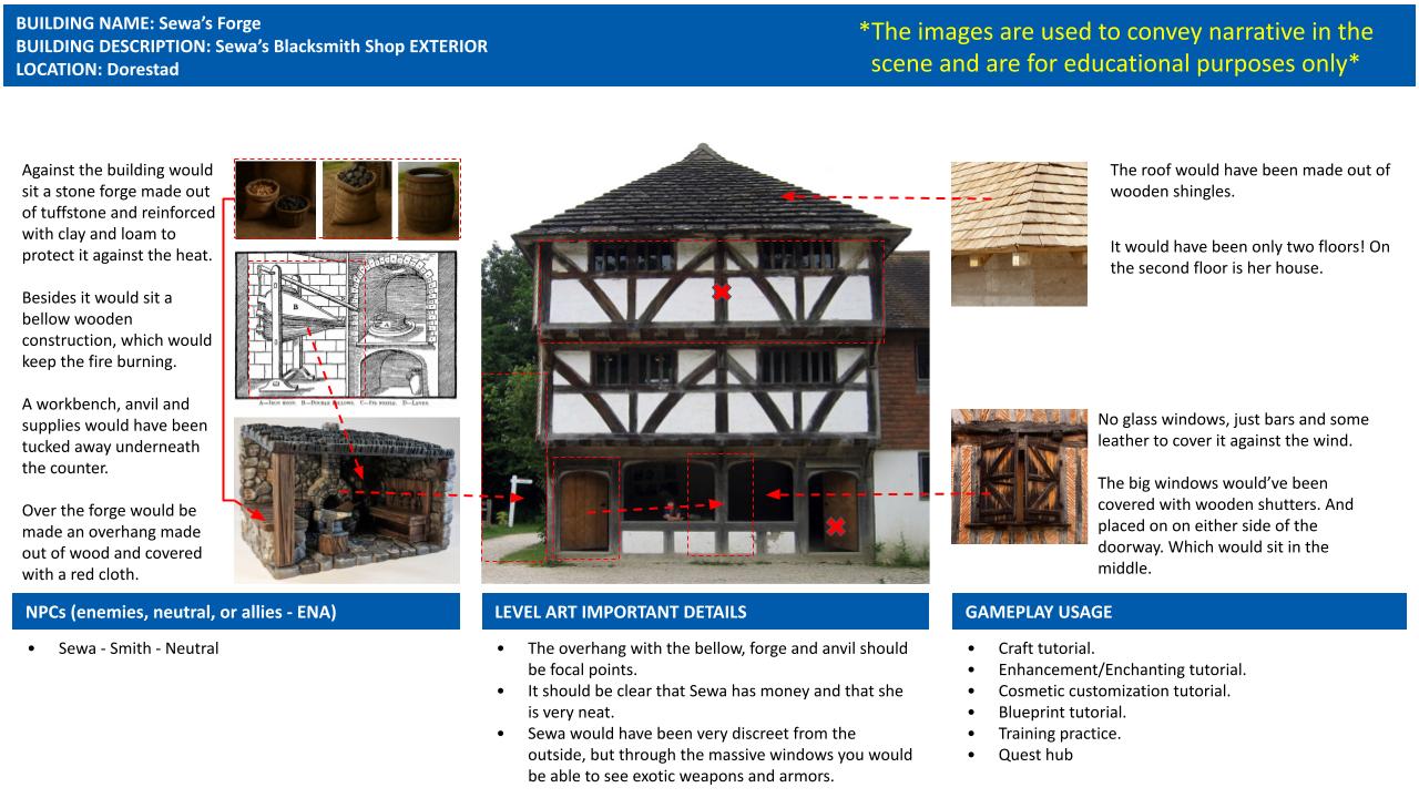 - Highlighted narrative and gameplay usage and tied them to key NPCs, with concise description for quick reference on how the environment supports the story.