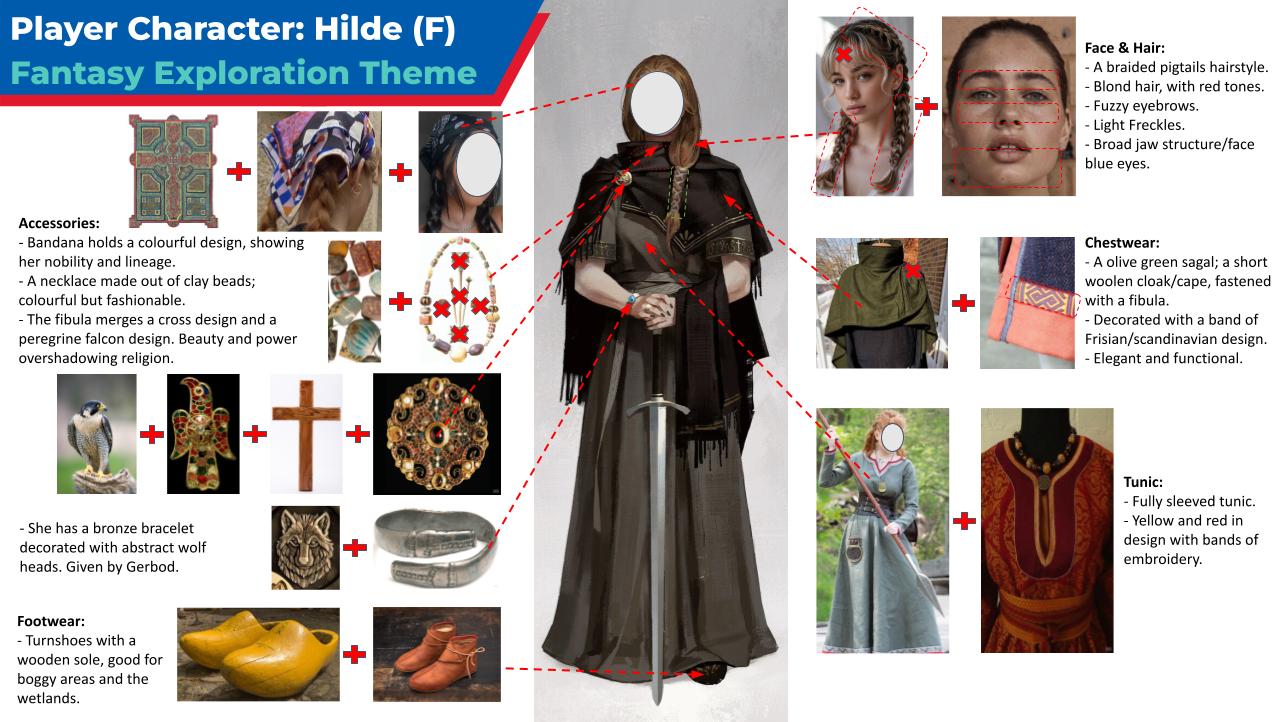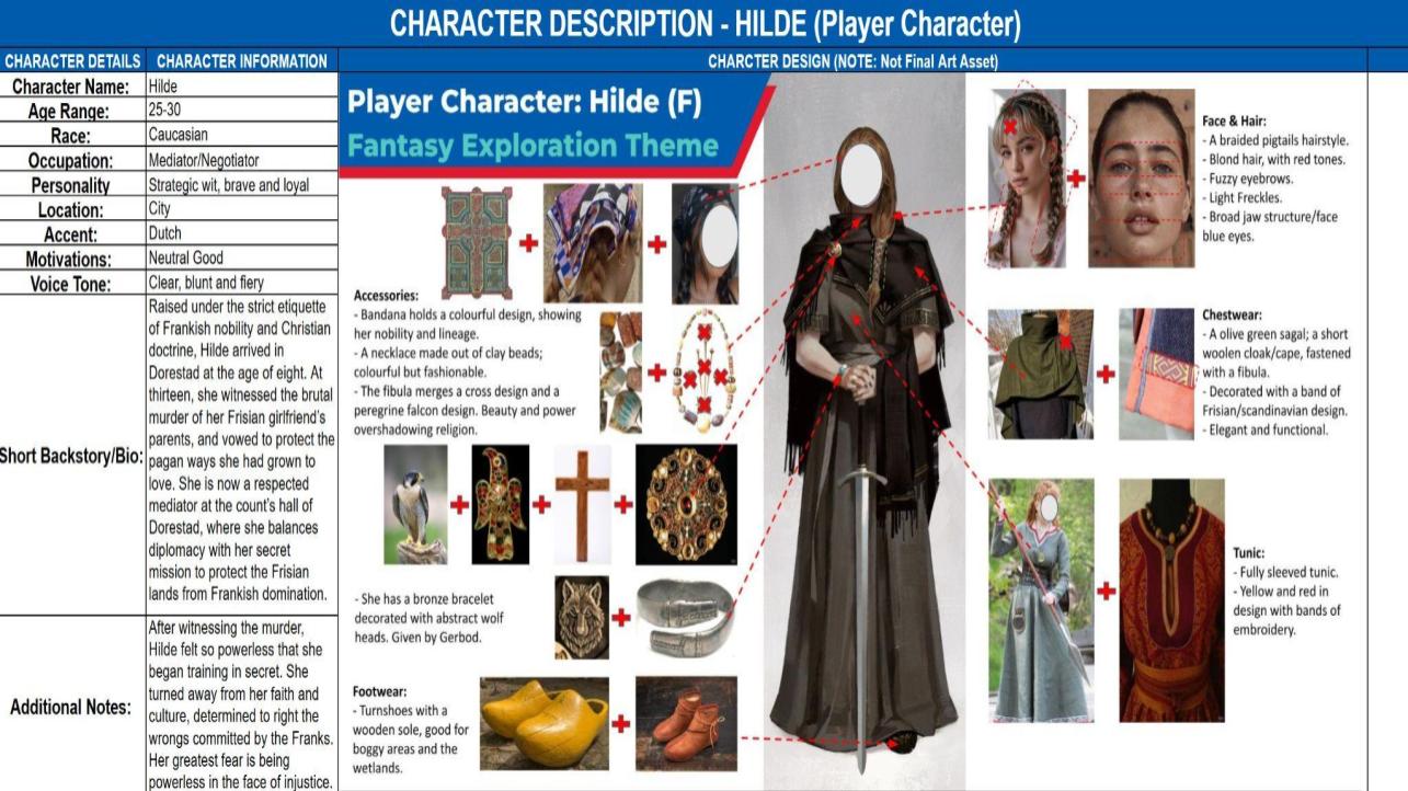 - Visual design. Based Hilde’s starting outfit on archaeological findings from Wijk bij Duurstede and wetland attire, embedding authenticity and narrative relevance from the get-go.