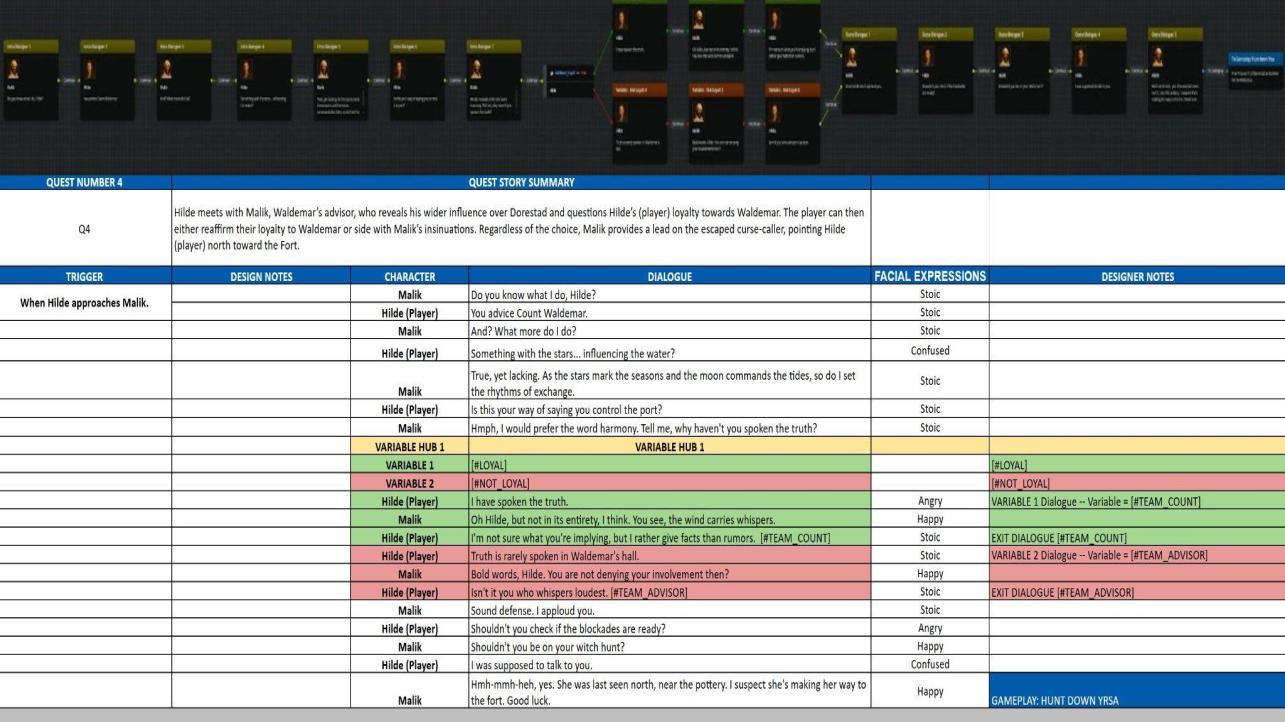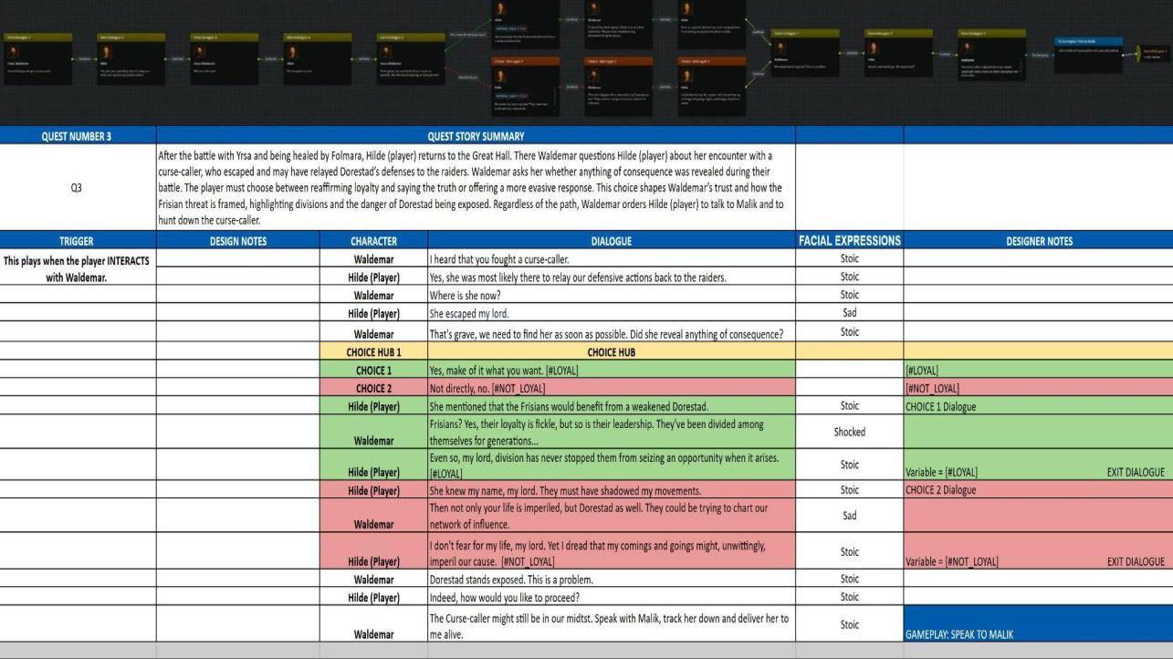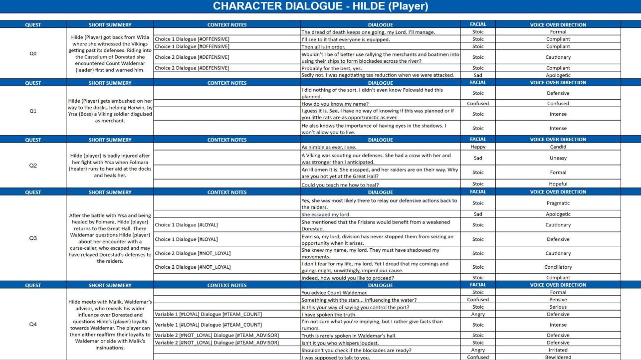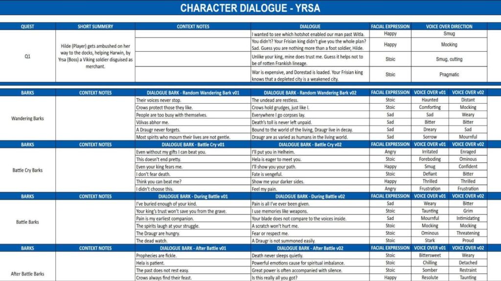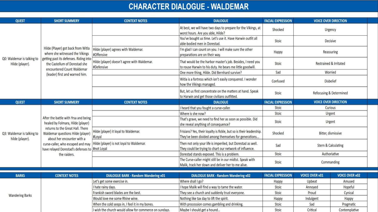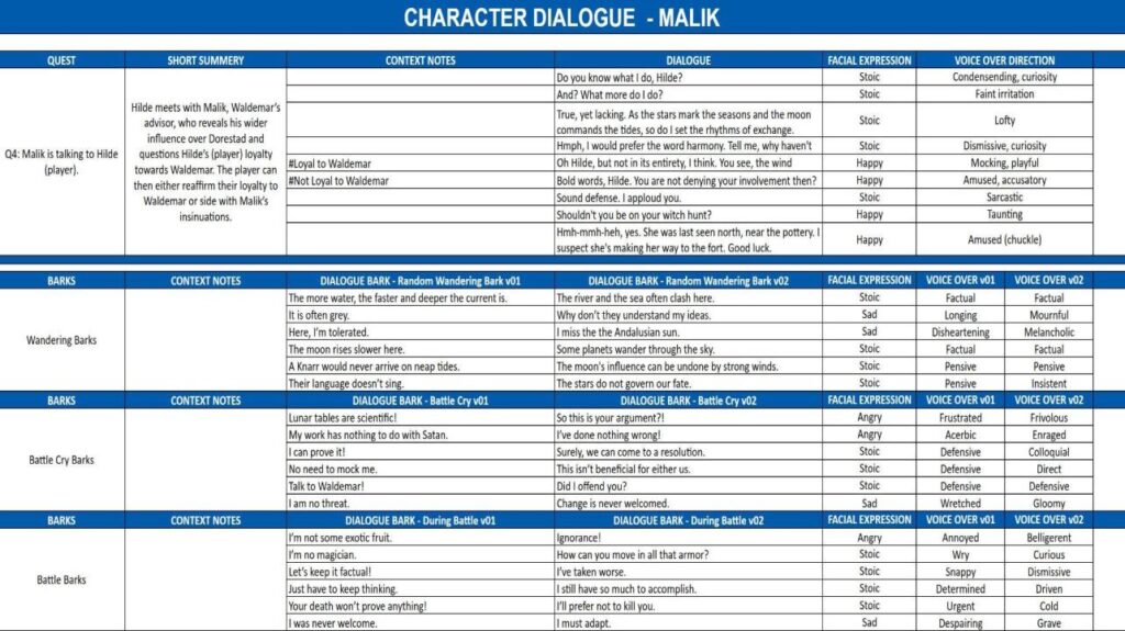 - A Character Dialogue Sheet with all the character lines sorted by quest and supported with a short summary, contextual notes, in-game facial expression, and voice-over directions.