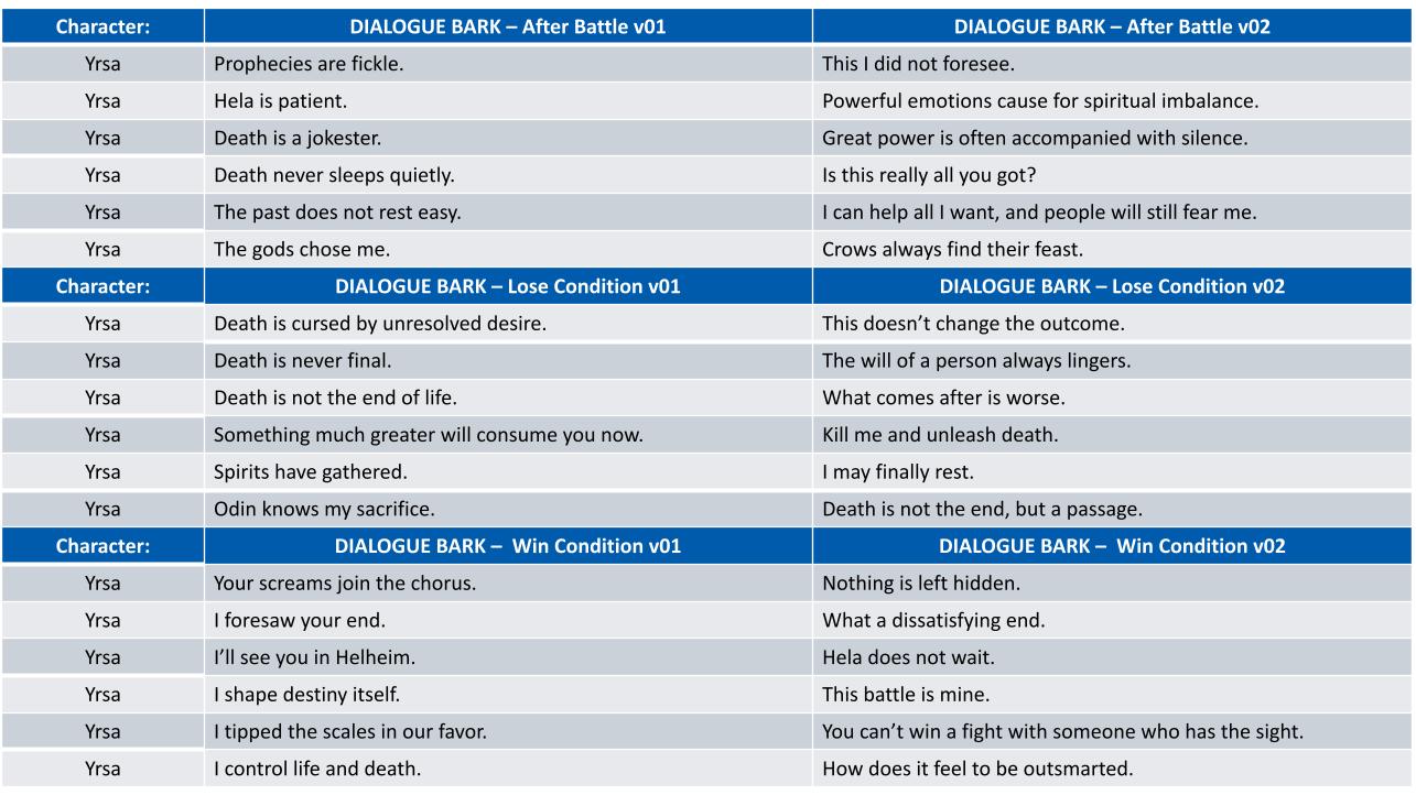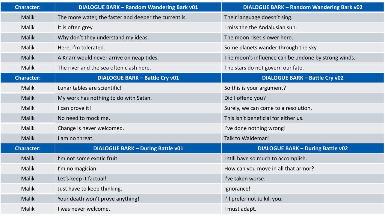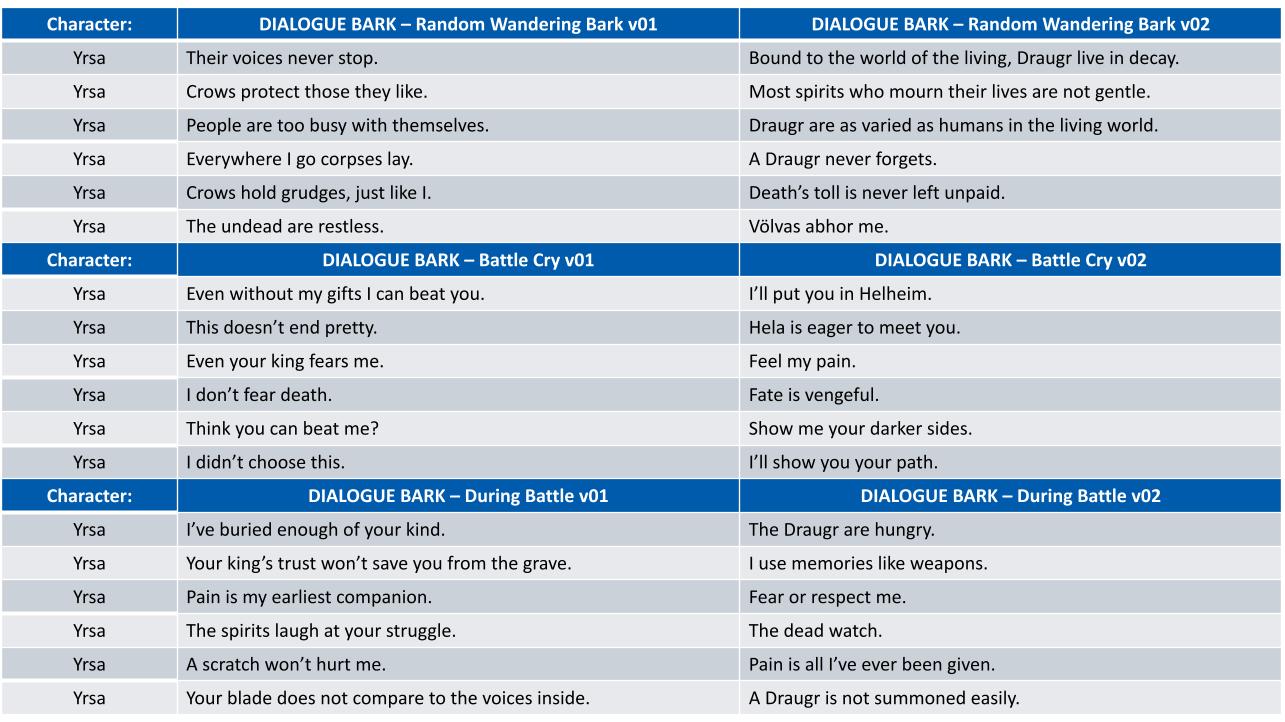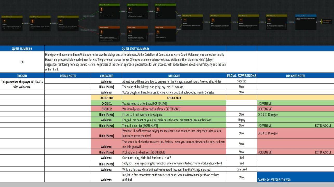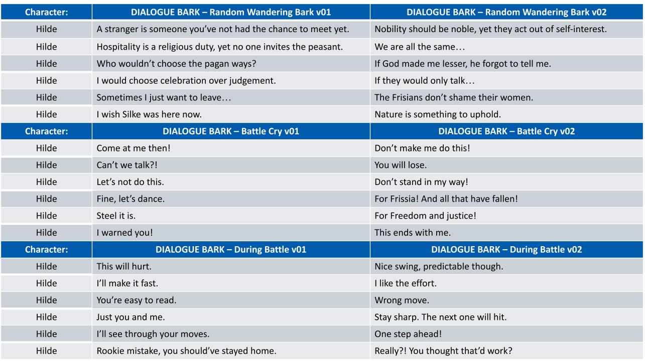 - A Character Dialogue Sheet with all the character lines sorted by quest and supported with a short summary, contextual notes, in-game facial expression, and voice-over directions.