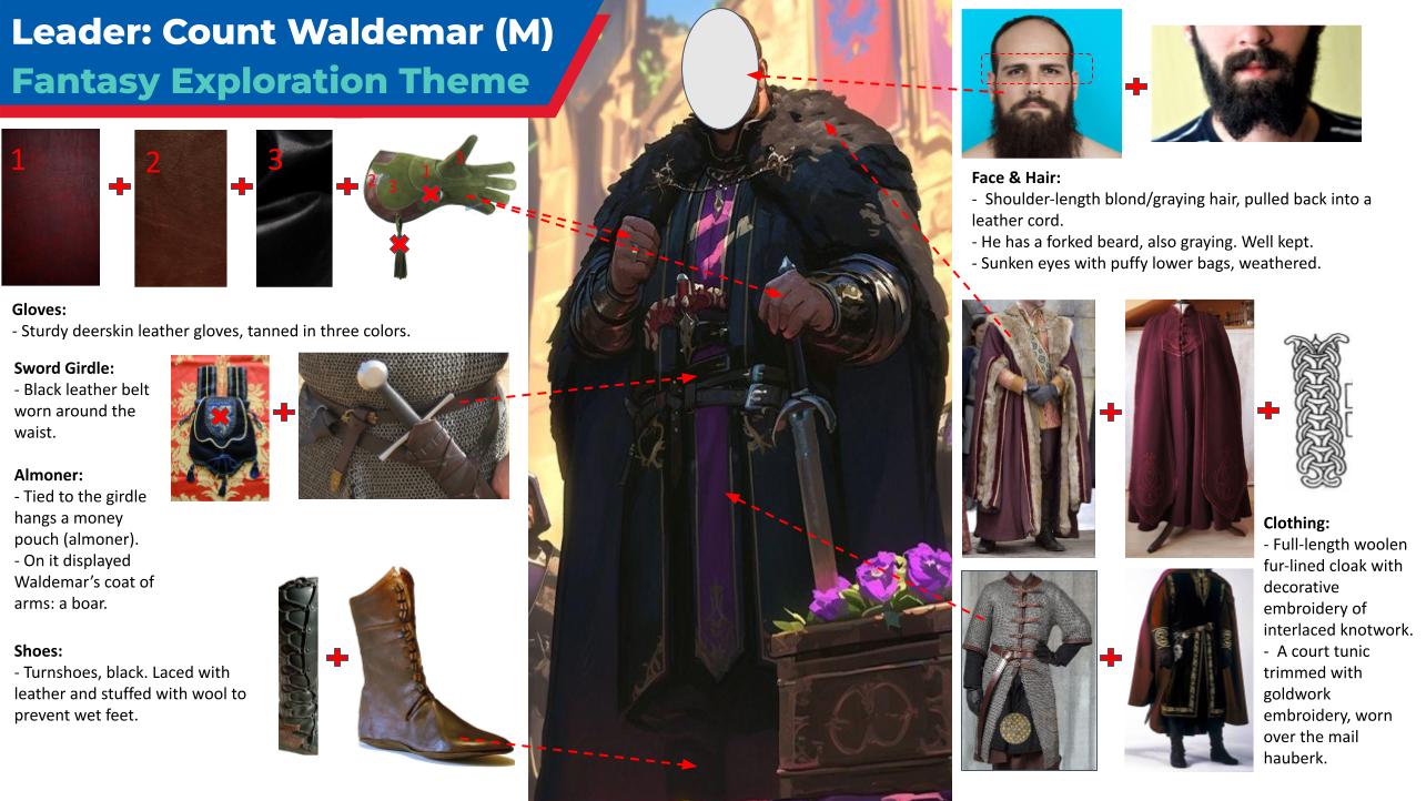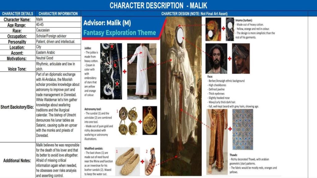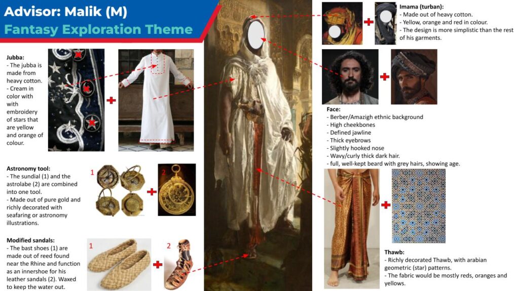 - Visual Design. His look blends The Moorish Chief, Alhambra patterns and Dorestad’s rainy climate together. His layered cloak-over-robes style reflects both origin and setting.