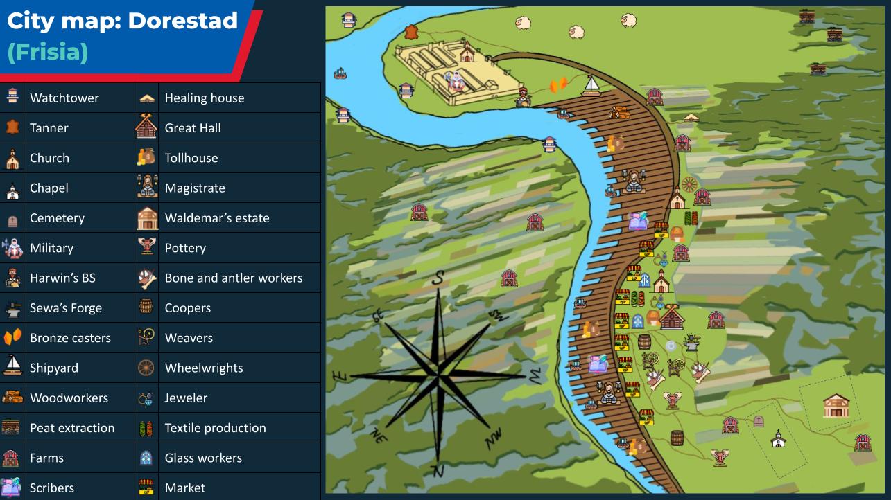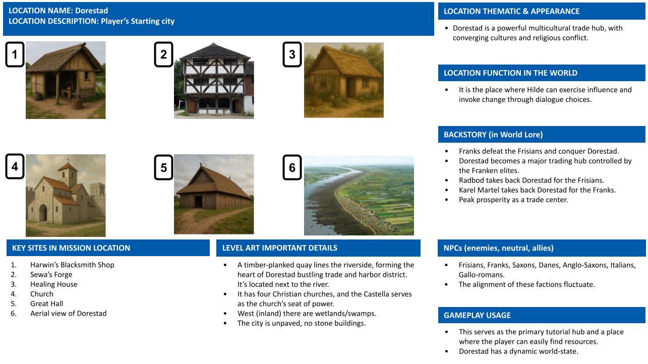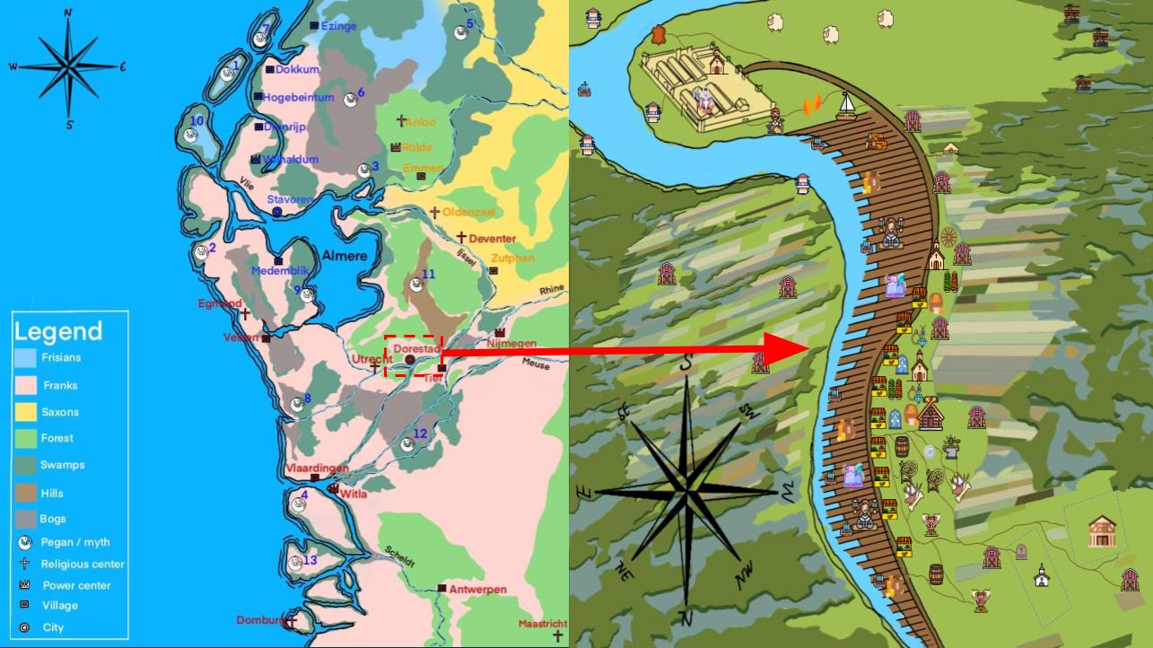 - Encourage exploration of the game world by pointing out key locations in Dorestad through contextual dialogue.