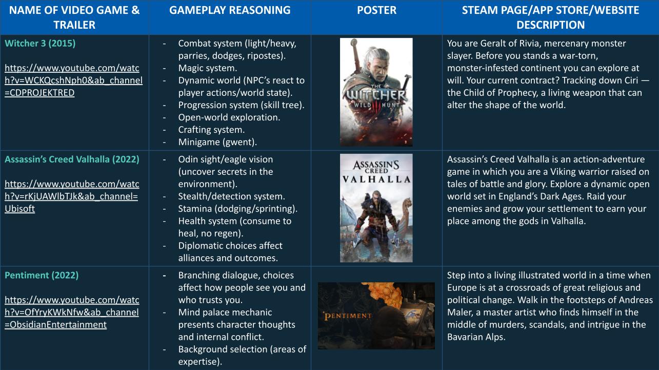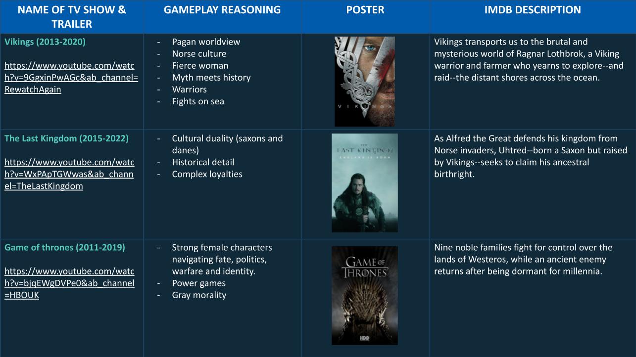 - Wrote focus notes on what elements to draw inspiration from, highlighting aspects that could inform Frisia’s themes, mechanics and audience appeal.