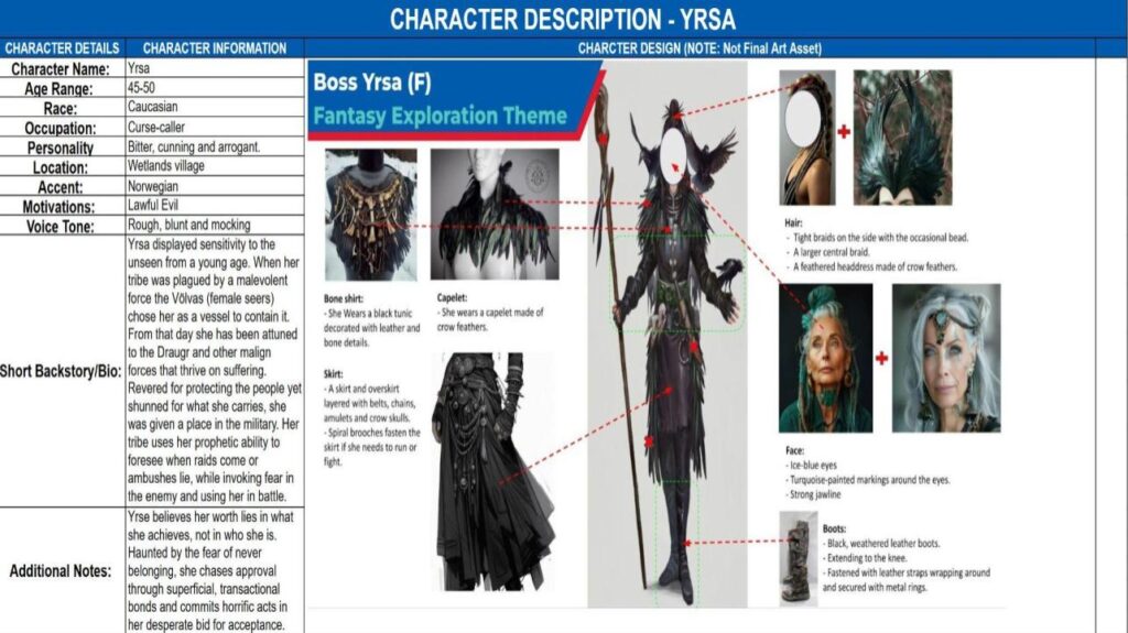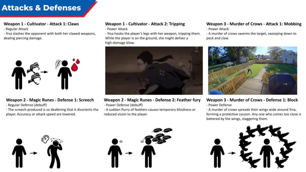 - Combat Design. Yrsa’s attacks are based on status effects, channelled through runes she carries and a murder of crows. She’s not afraid to get close and using brute force to overwhelm the player.