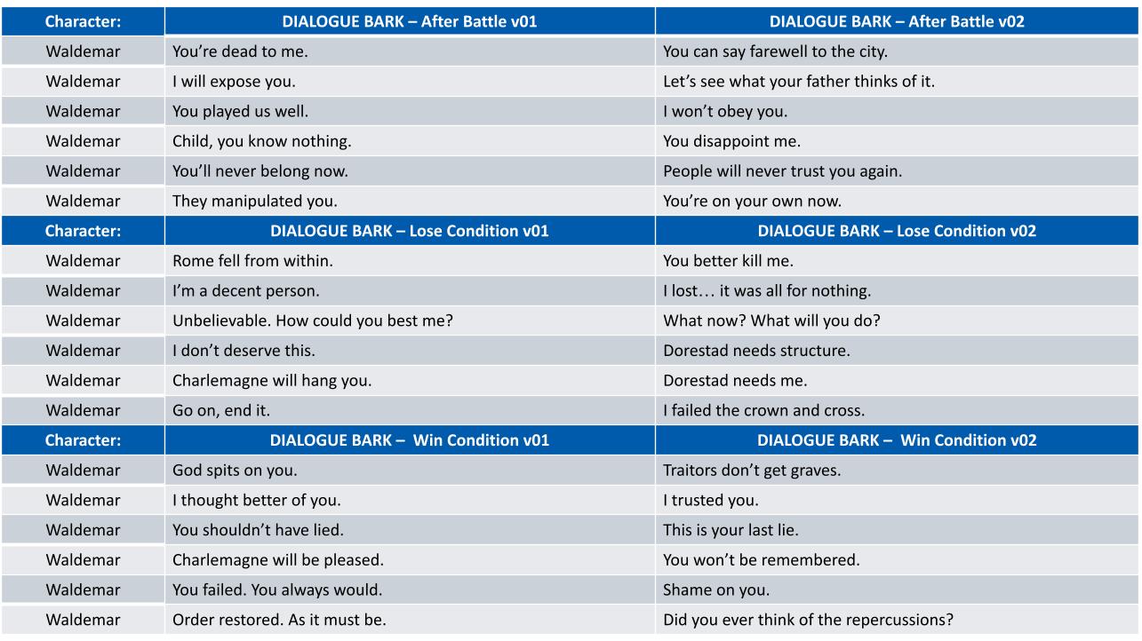 Developed VO Documents for four key characters (Player, King, Advisor, Enemy) to support the audio team and the actors by giving clear directions, resulting in faster and better voice recording sessions.