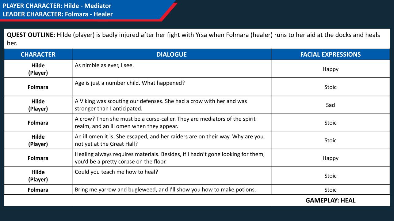 - Introduce the player to new gameplay systems, by establishing Harwin as the blacksmith, staging Hilde’s (player) first encounter with Yrsa (enemy) to teach battle mechanics and introduce potion-making as healing tutorial.